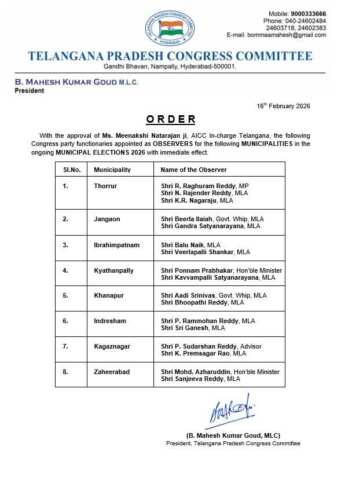 8 హంగ్ మున్సిపాలిటీలకు అబ్సర్వర్లను నియమించిన కాంగ్రెస్ AICC ఇంచార్జి మీనాక్షి నటరాజన్ ఉత్తర్వులు జారీ చేసిన పీసీసీ చీఫ్ మహేష్ కుమార్ గౌడ్