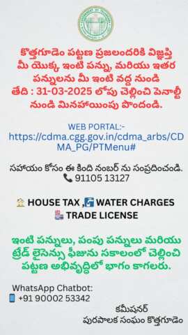 ఈనెల 31 లోపు ఇంటి వద్ద నుంచి మీ మీ ఇంటి పన్నులు, ఇతర పనులు చెల్లించి పెనాల్టీ నుంచి మినహాయింపు పొందాలని భద్రాద్రి కొత్తగూడెం పురపాలక సంఘం కమిషనర్ ఒక ప్రకటనలో కోరారు. ప్రభుత్వ వెబ్సైట్ WEB PORTAL:-https://cdma.cgg.gov.in/cdma_arbs/CD MA_PG/PTMenu# ఇంటి వద్ద నుంచి పురపాలక సంఘం పరిధిలోని ఇంటి పన్నులు, పంపు పనులు, ట్రేడ్ లైసెన్స్ ఫీజులు చెల్లించాలని కోరారు. పురపాలక సంఘం ప్రజలు తమ అనుమానాలను నివృత్తి చేసుకోవడానికి 9110513127 అనే నెంబర్లో సంప్రదించాలని కోరారు.