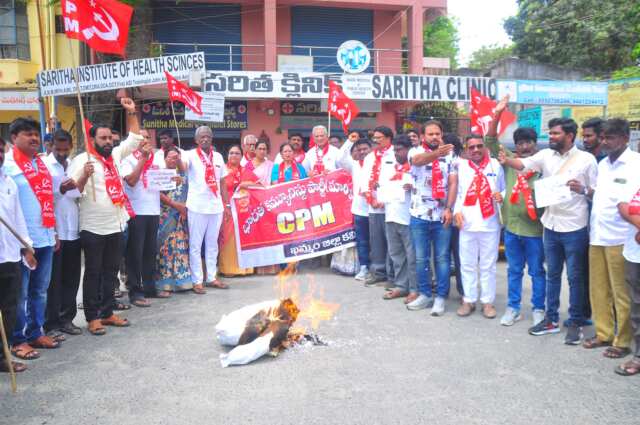 డిమాండ్ చేశారు. సిపిఎం నాయకులు, విద్యార్థుల అక్రమ అరెస్టులను నిరసిస్తూ రాష్ట్ర కమిటీ పిలుపు మేరకు బుధవారం ఖమ్మం జిల్లా కేంద్రంలో సరిత క్లినిక్ సెంటర్ వద్ద దిష్టి బొమ్మ దగ్ధం కార్యక్రమం జరిగింది. అంత కు ముందు పార్టీ జిల్లా ఆఫీస్ సుందరయ్య భవన్ నుండి నిరసన ర్యాలీ ప్రాంభమై,సరిత క్లినిక్ వరకు కోన సాగుంది.